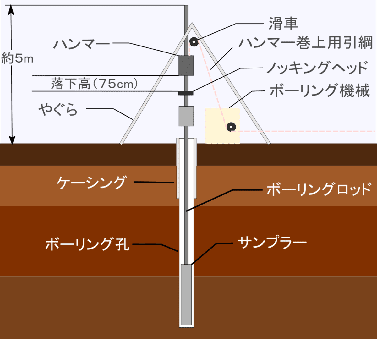 標準貫入試験はボーリングBoringによって掘削した孔を利用して、1mごとに地盤の硬さを調査します。測定方法は、63.5kgのハンマー(おもり)を75cmの高さから自由落下させて、サンプラーを土中に30cm貫入させるのに要する打撃回数を測定します。この打撃回数がN値で、地盤の硬さを示します。地盤調査で出たN値が大きいほど、地盤は硬く締まっているといえます。通常は、土のサンプリングと同時に行なわれます。