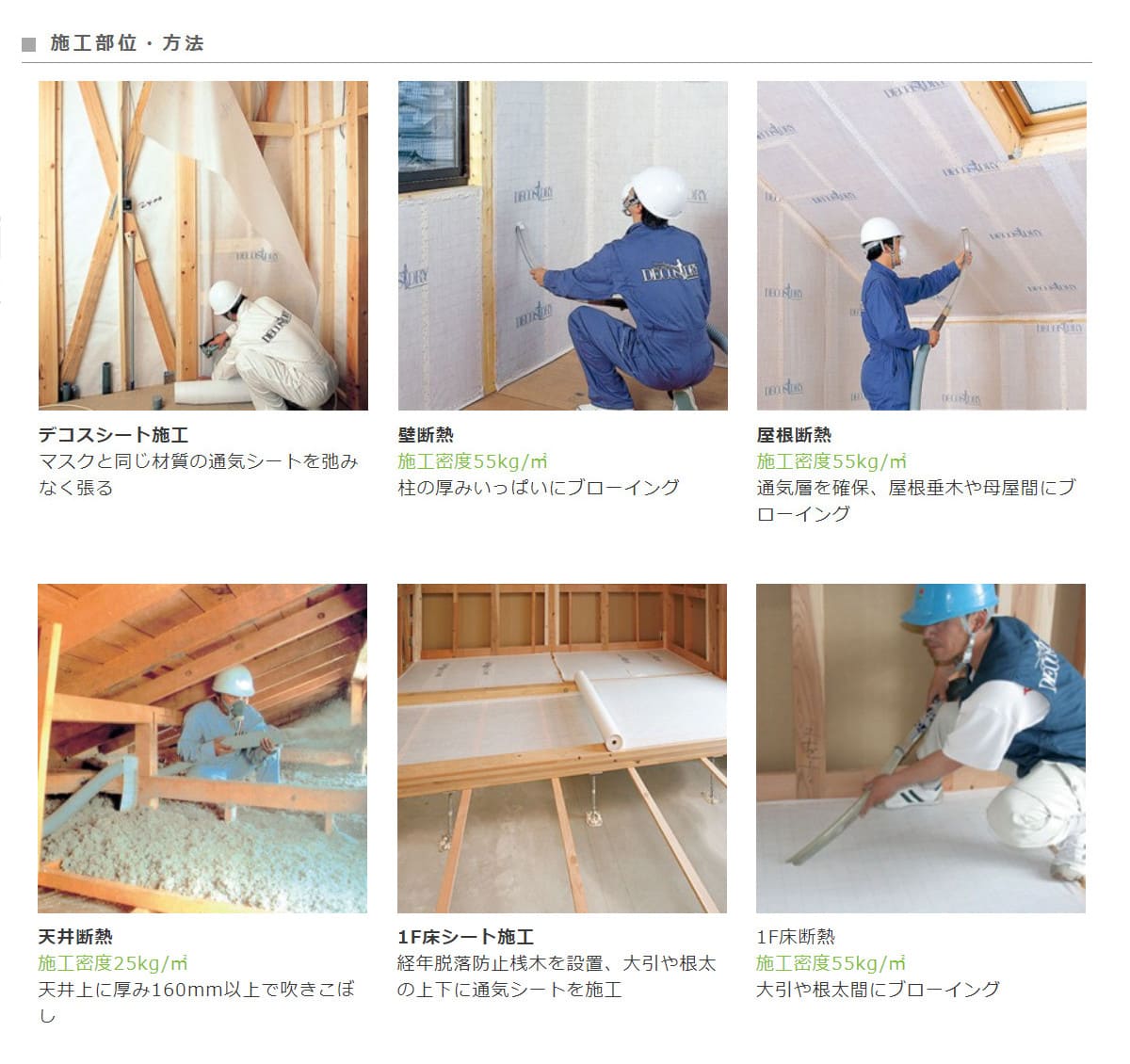 これから一連の仕組みによりはじめて確実にデコスファイバーは施工され、設計性能通りに熱損失を防ぎ、抜群の断熱性・調湿性・吸音性を最大限に引き出すことが出来るのです。