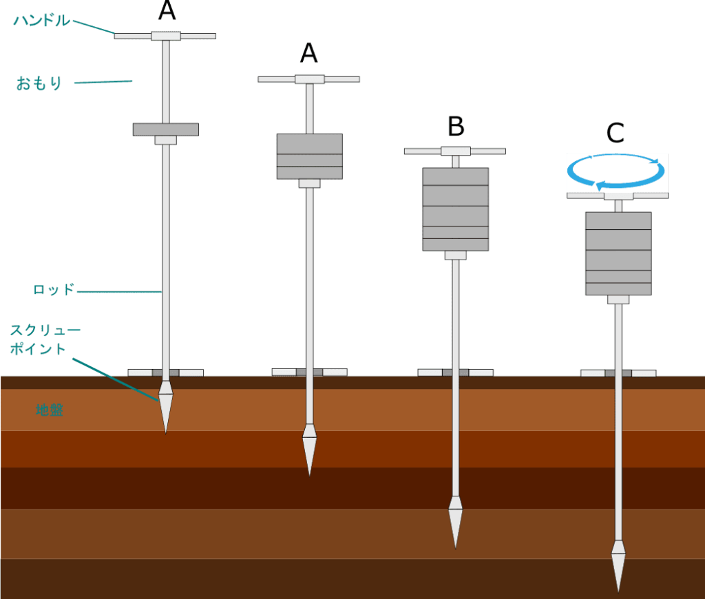 C ロッドを継ぎ足しながら、25cmずつ貫入させるのに要した回転数を記録していきます。通常、10mの深さに達するか、固い地層に達するまで続けます。